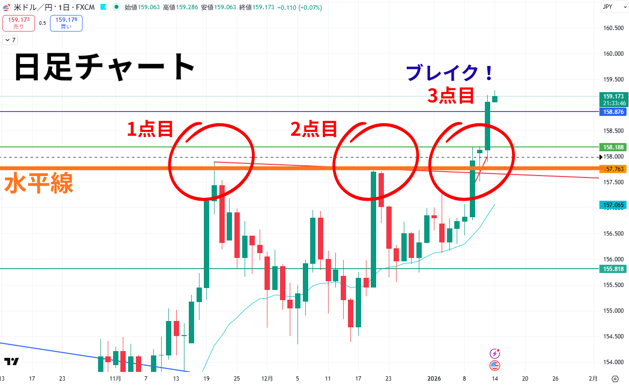 また、プライスアクションだけではなく、下記の日足チャートを見ていただくと、抵抗されていたラインを3点目で抜けています
