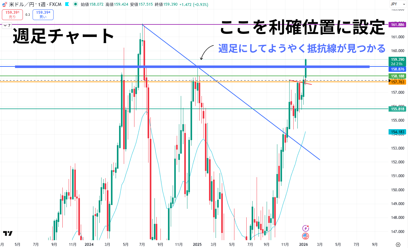 今回、難しかったのは利確位置です。理由としては左側の波が日足レベルでも無く、週足にしないと抵抗線を見つけることができなかったからです