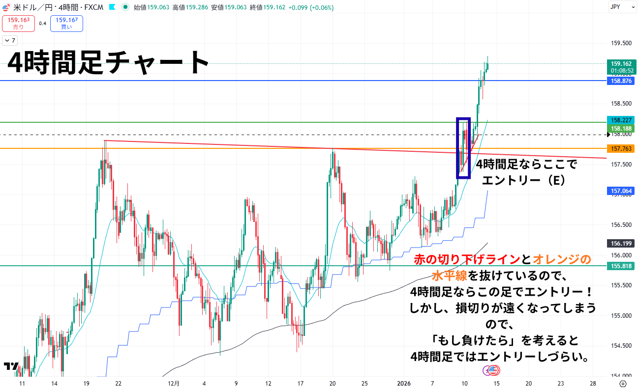 4時間足では水平線、切り下げラインを引くことができ、抜けた足でエントリーすることは可能です。