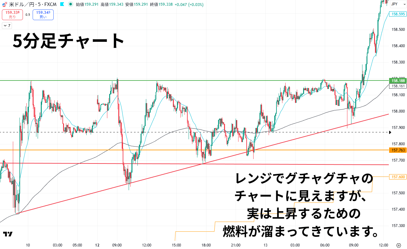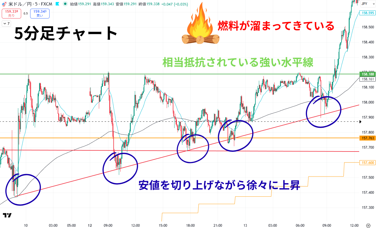 これだけの根拠が揃っていれば、5分足の水平線ブレイクでエントリーしても騙される可能性が低く、大きく上昇する可能性が高くなります