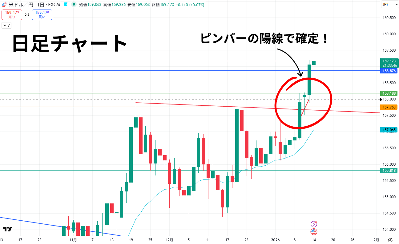 まず、1月12日の日足の確定ですが、陽線のピンバーです。