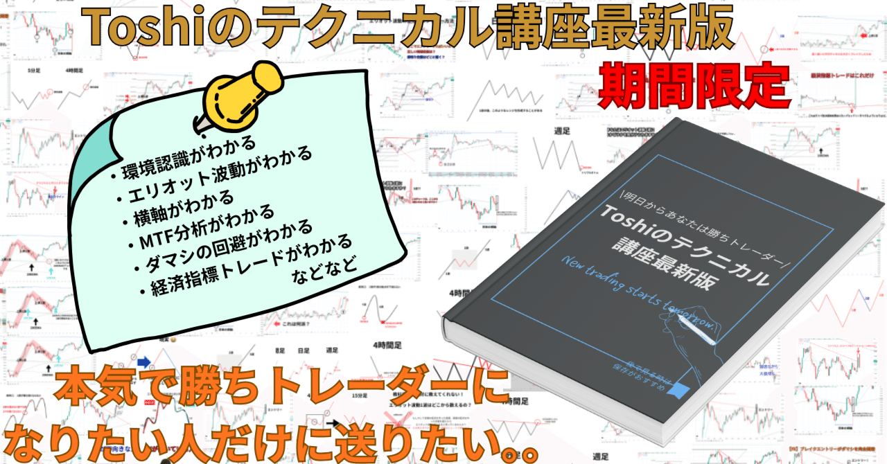 投資をしているはずなのにマイナスが続いている人には最初に見てほしい内容となっていますので、まだ「Toshiのテクニカル講座最新版」を見ていない方は、ぜひ見てみてください。