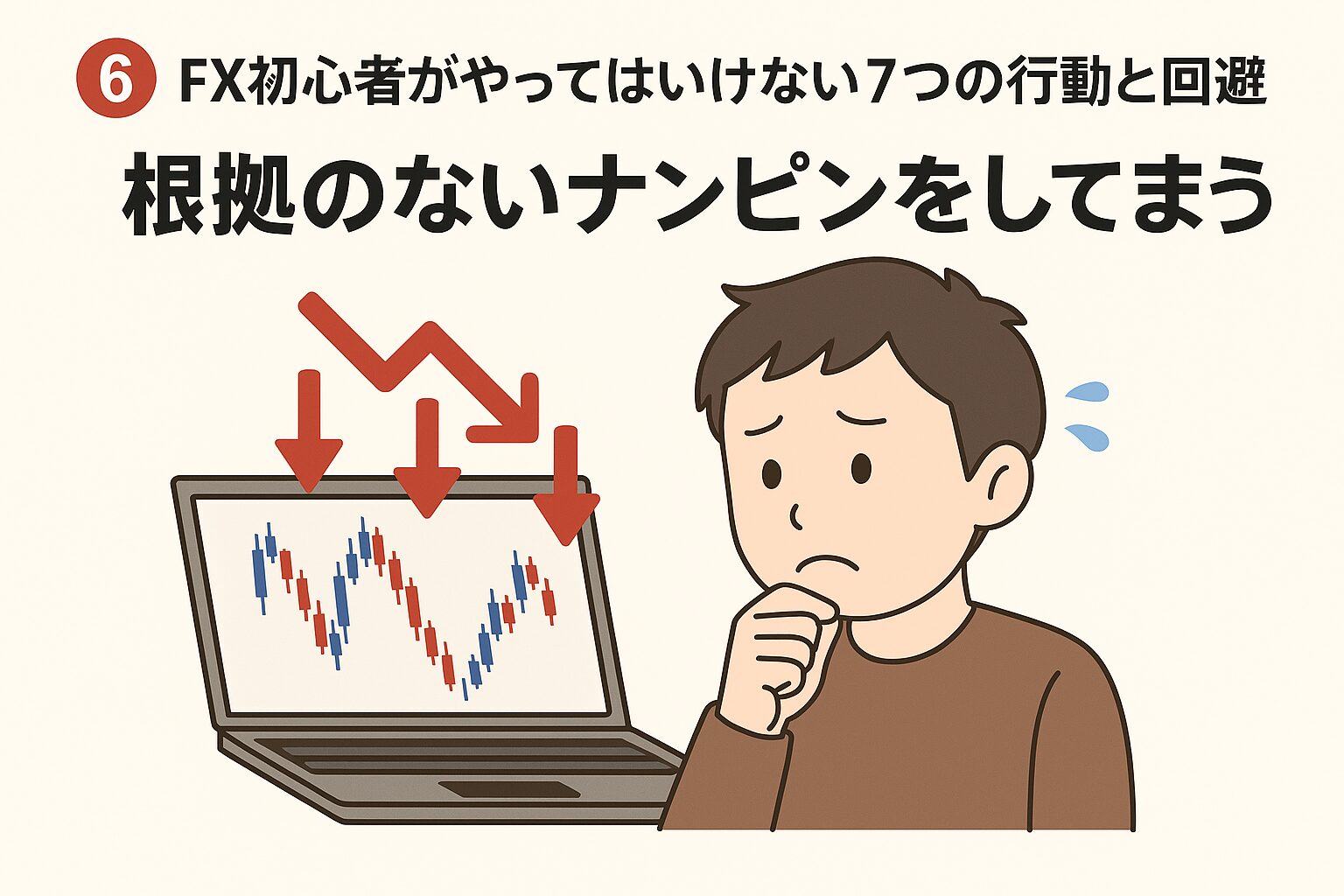 初心者にとって最も危険な行動のひとつが、損失が膨らんでいる状態でさらにポジションを追加する、いわゆるナンピンです。特に「あと少しで戻るはず」「今が一番安いに違いない」といった気持ちが先行し、明確な根拠もなくポジションを積み増してしまうことがよくあります。このような感覚頼りのナンピンは、結果的に損失を大きくし、口座資金を一気に減らす要因となります。