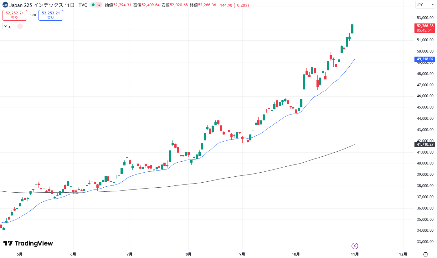 その後の首相指名選挙で無事に高市総裁が誕生したことで、再び上昇に転じました。ここがサナエノミクスの初動であり、高市トレード開始でもあります。
