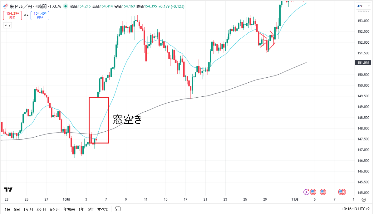 下記はドル円の4時間足チャートですが、上に窓空きが発生しています。これが自民党総裁選で高市早苗氏が総裁になったときのドル円の動きです。