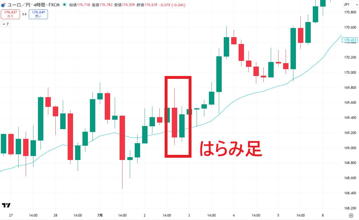 また、「はらみ足」は小さなローソク足が前の大きな足の中に収まるパターンで、迷いの状態を示唆しつつ、ブレイクでトレンドが転換する可能性があることを示します。
