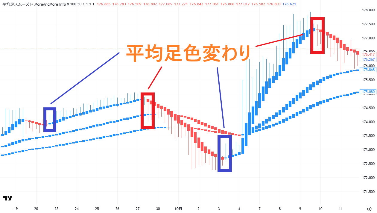 平均足は、ローソク足よりもトレンドの流れを視覚的に捉えやすいという特徴があります。特に「青→赤」や「赤→青」などの色の切り替わりは、転換のタイミングを察知する重要なサインです。