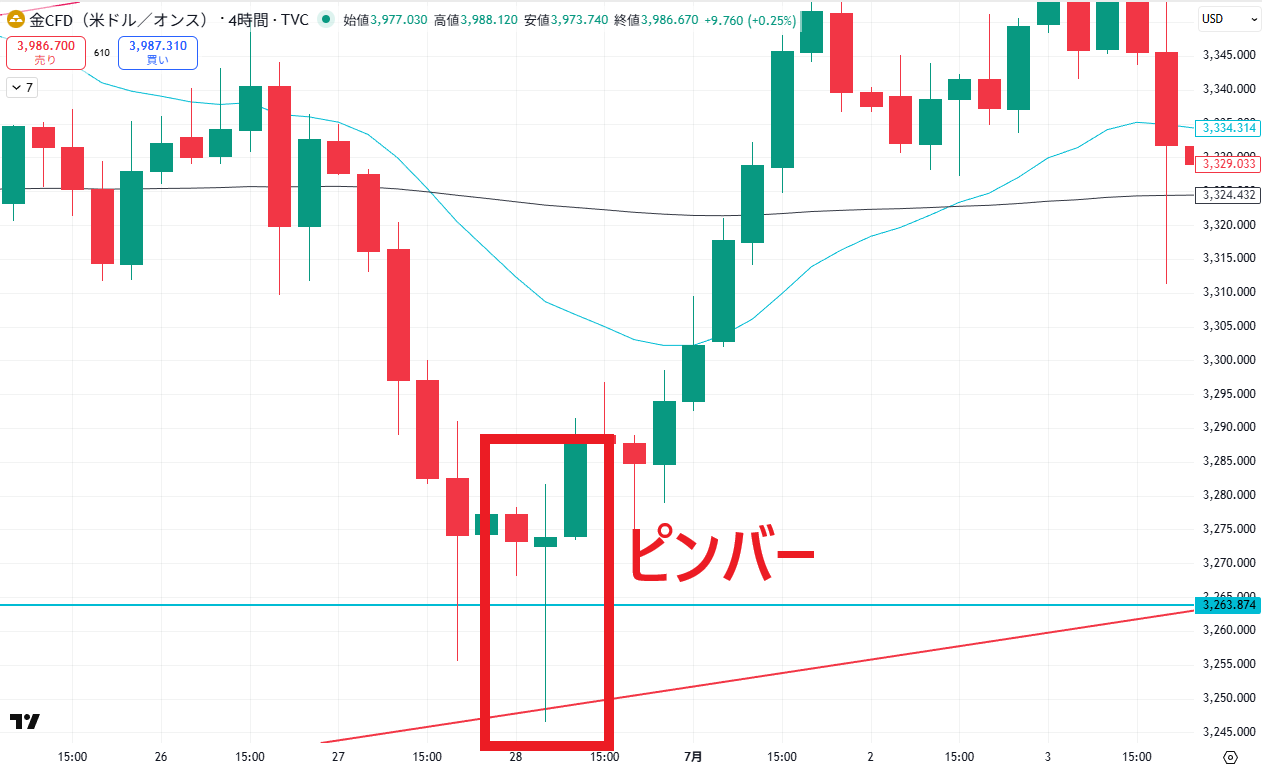 例えば「大陰線 → ピンバー → 陽線」の流れが見られた場合、明確な売りから買いへの切り替わりと捉えることができます。