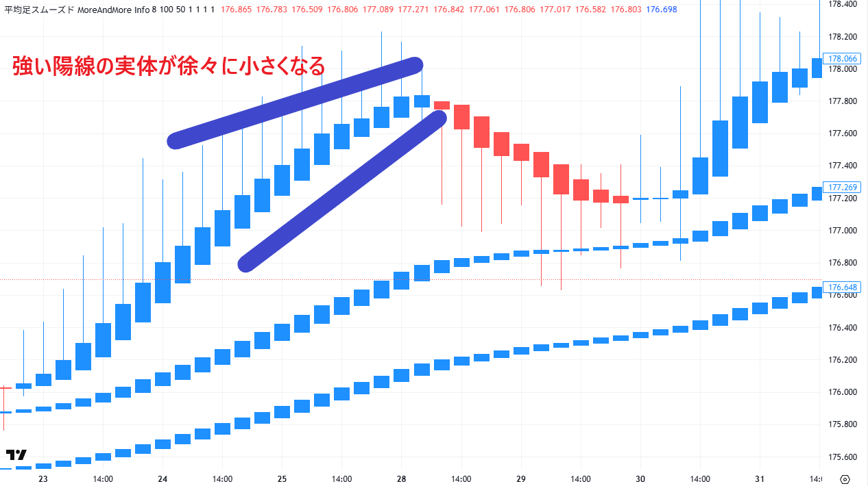 また、実体の大きさの変化にも注目すべきです。強いトレンドが続いていた平均足の実体が次第に小さくなり、ヒゲが目立ち始めた場合は、相場の勢いが弱まりつつある兆候です。