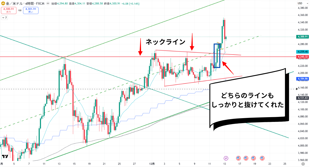 ゴールドは12月11日にも記事にしており、そこでは「ネックとなる水平線を抜けて、下位足で形作ったらスイングで持つかも」と話していました。