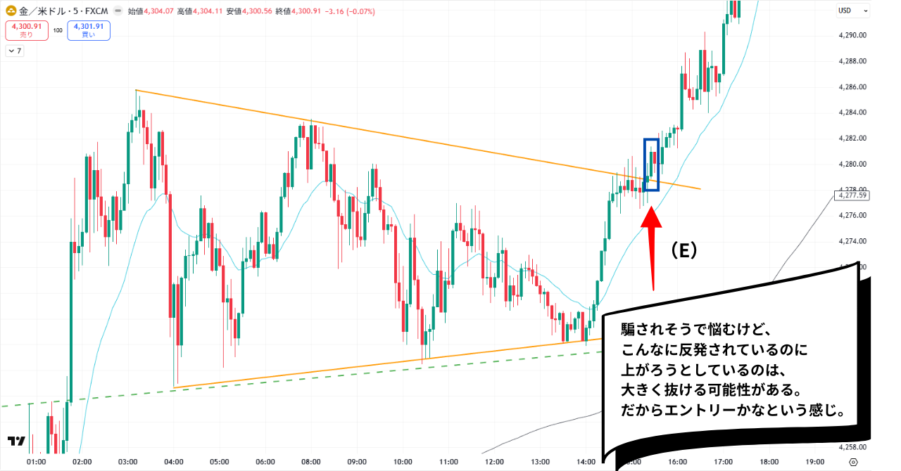 今回、5分足の三角保ち合い抜け後にエントリーしましたが、普段ならしていないと思います。