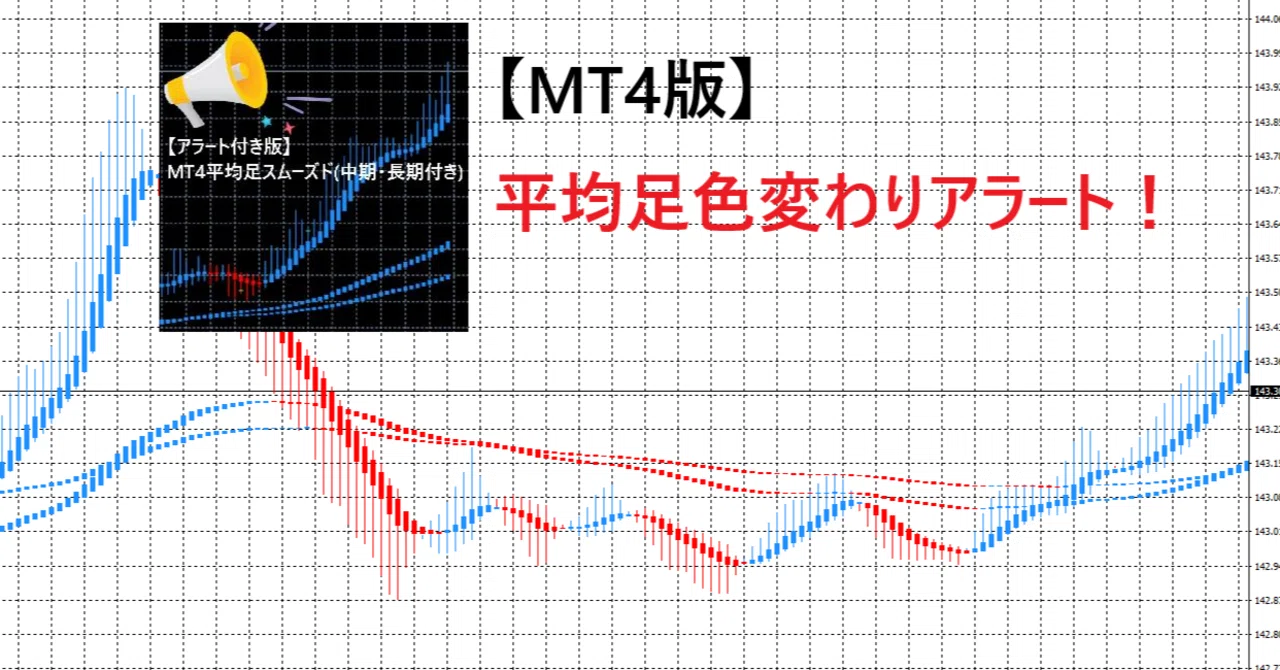 - 平均足スムーズド、中期、長期もセットで付属している