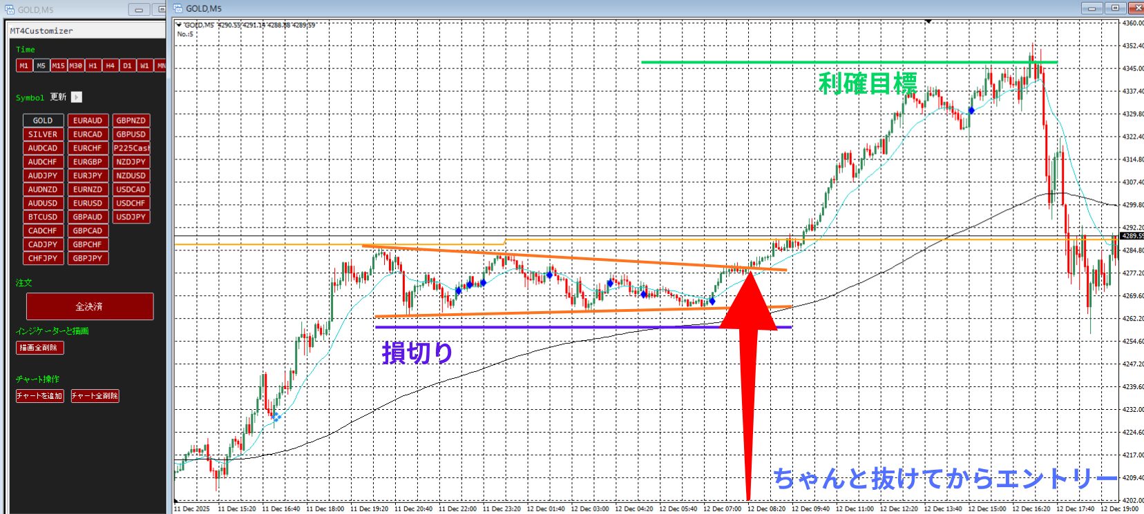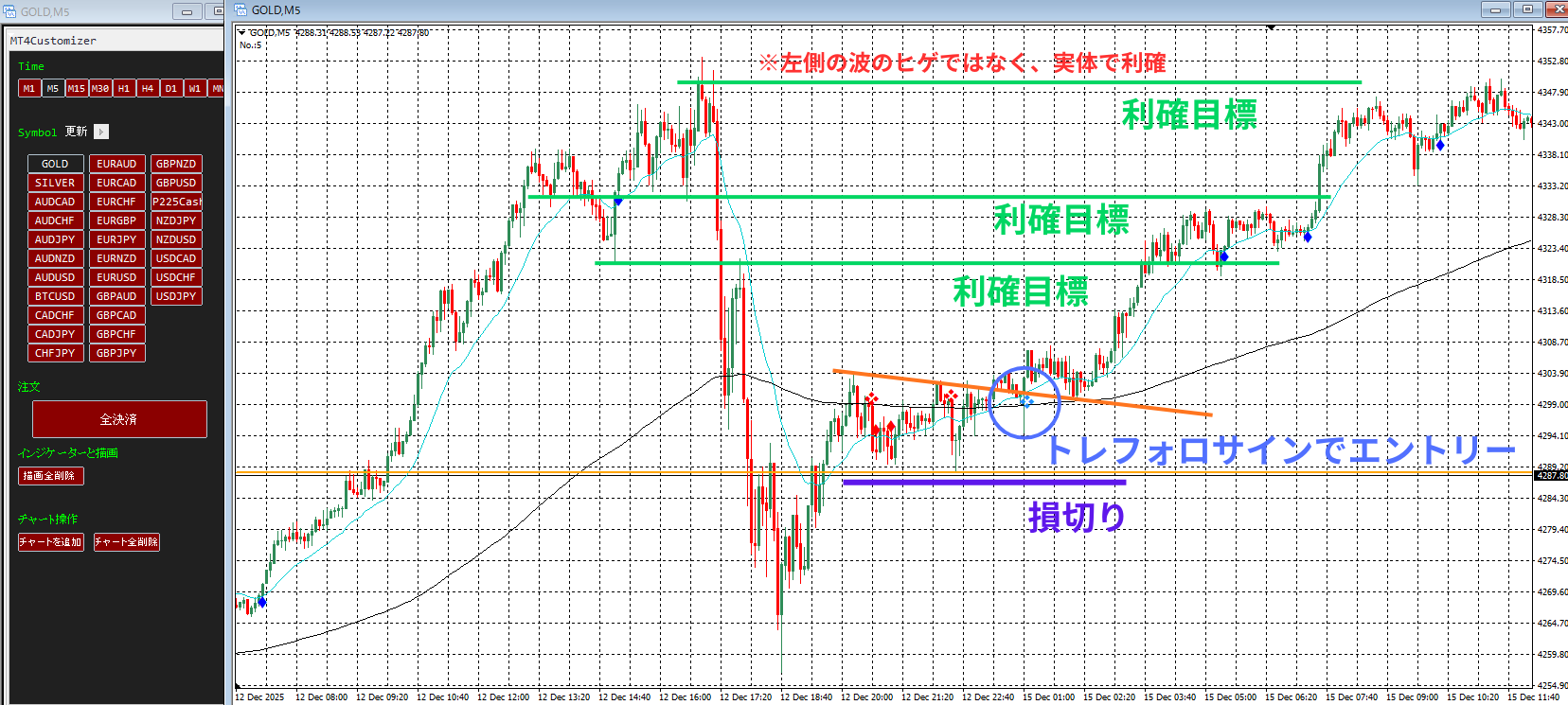 ゴールドは、12月13日に日付が変わったくらいから大きく下落し、12月15日の朝一からリバりそうなチャートの形状をしていました。