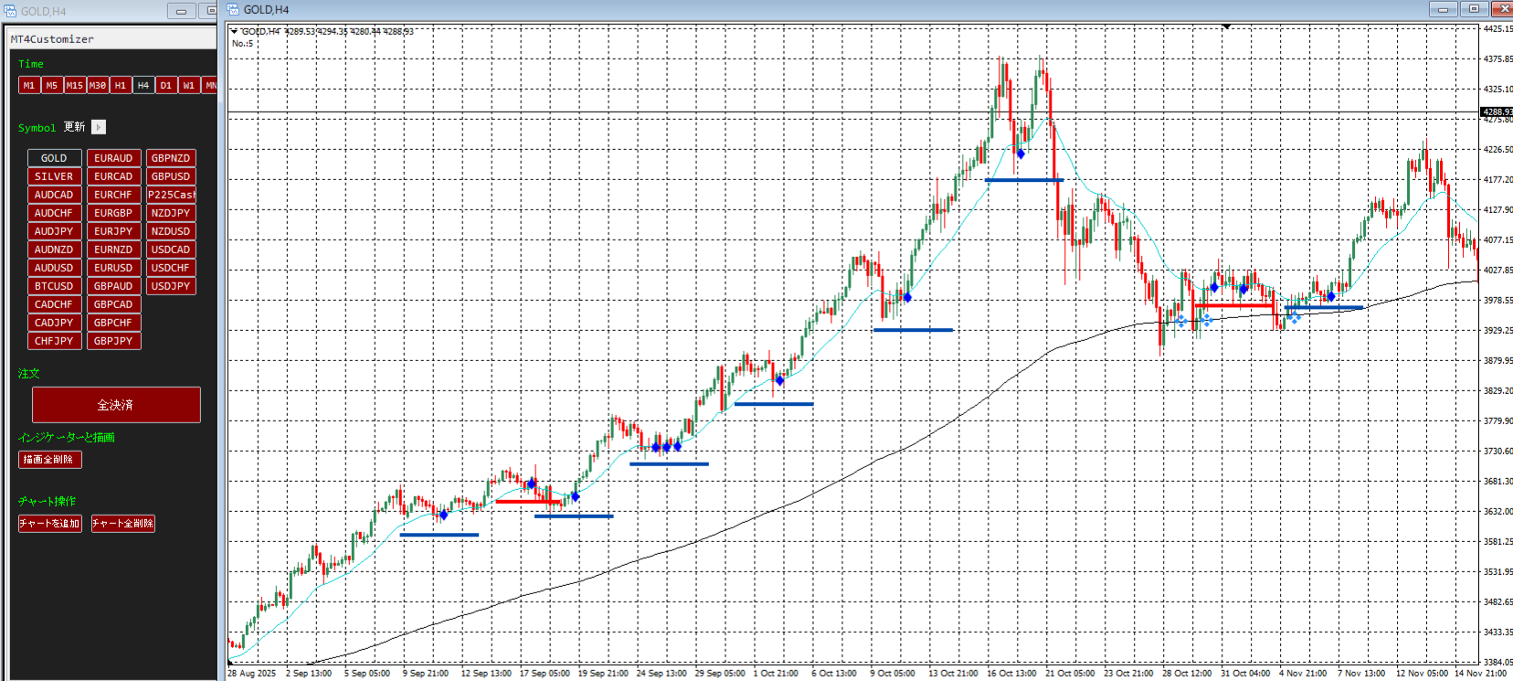上記はゴールド4時間足チャートですが、赤線が負けなので合計3回しか負けていません。