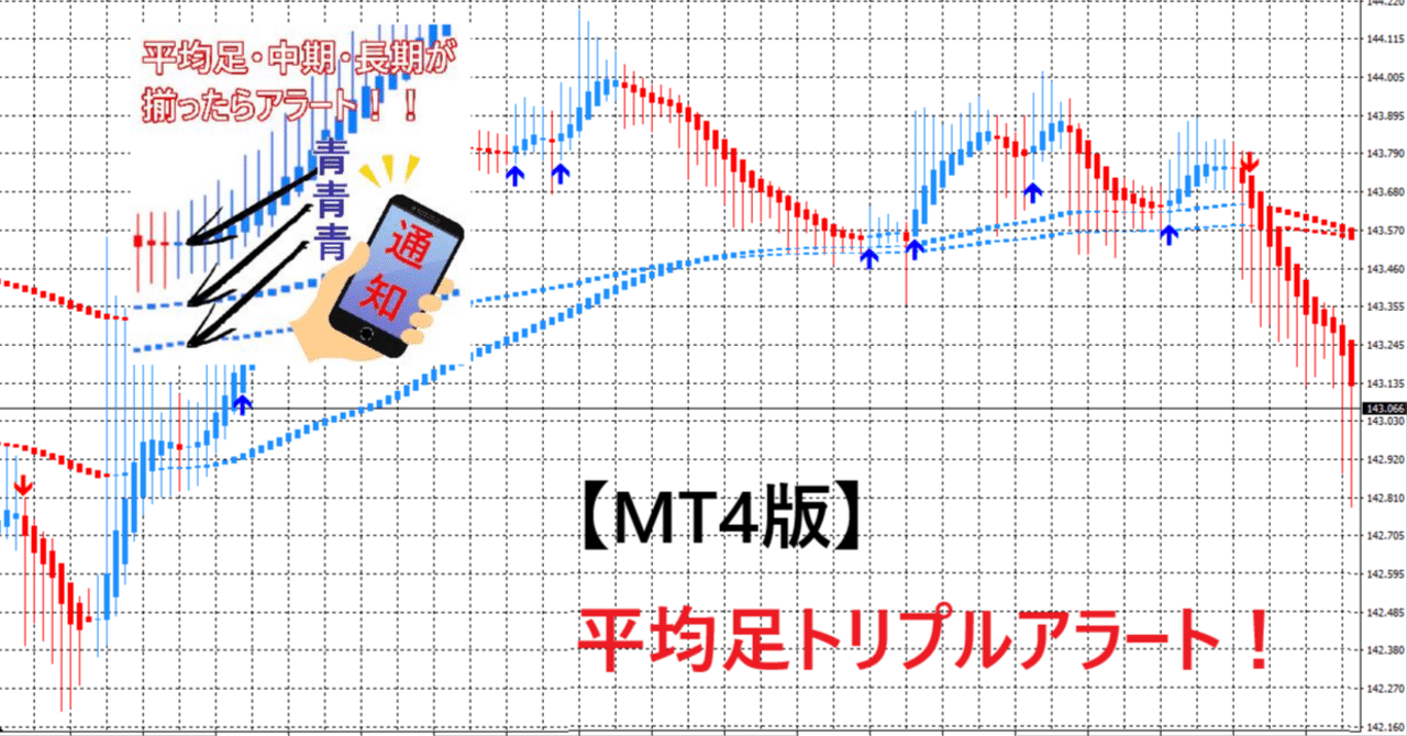 MT5版平均足トリプルアラートは、平均足スムーズドをベースにした高度なトレンド検出インジケーターです。3本の平均足が同時に揃ったときだけシグナルを出すことで、ノイズやダマシを大幅にカットし、信頼性の高いエントリーポイントを提供します。