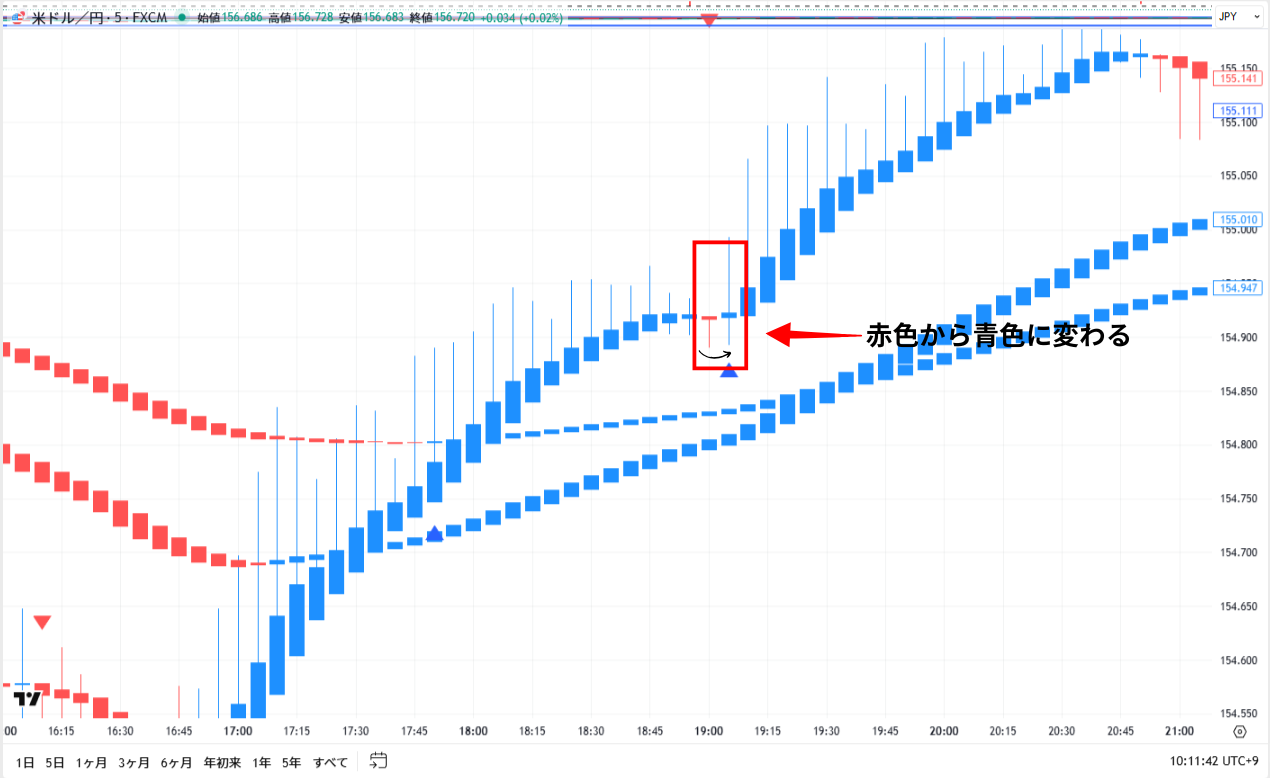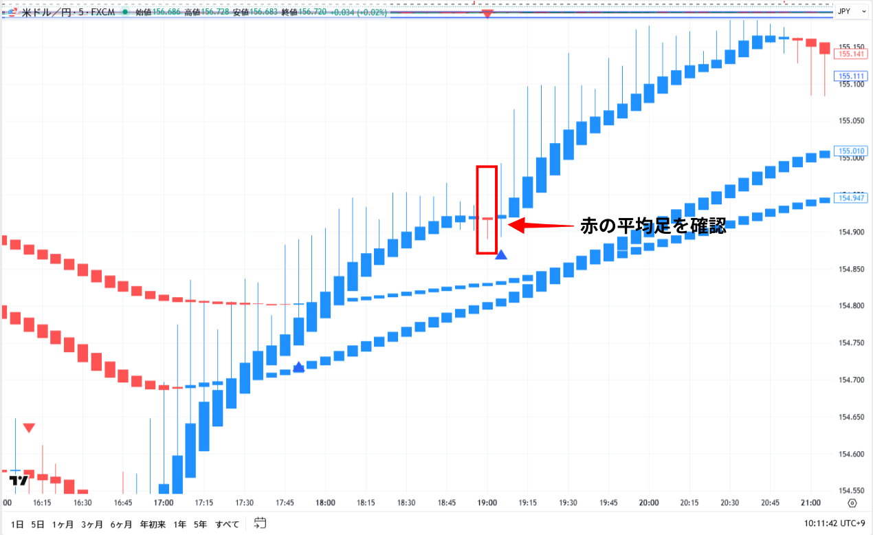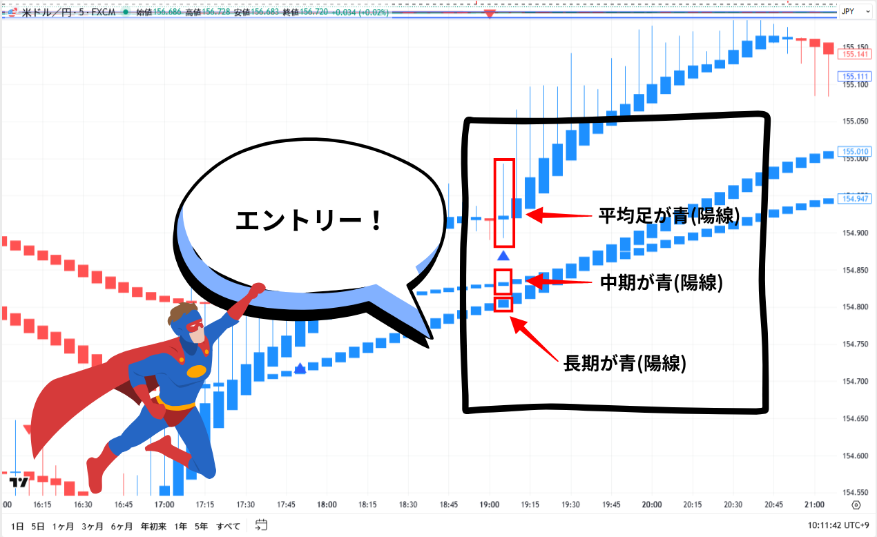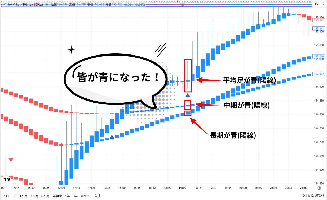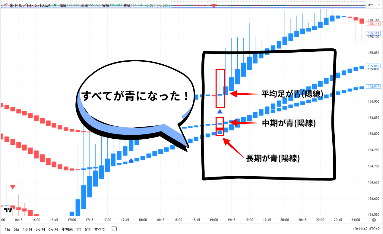 このように平均足と中期・長期がすべて青になっています。このタイミングでエントリーしていきます。(詳しいエントリー方法は次の見出しで解説します!)