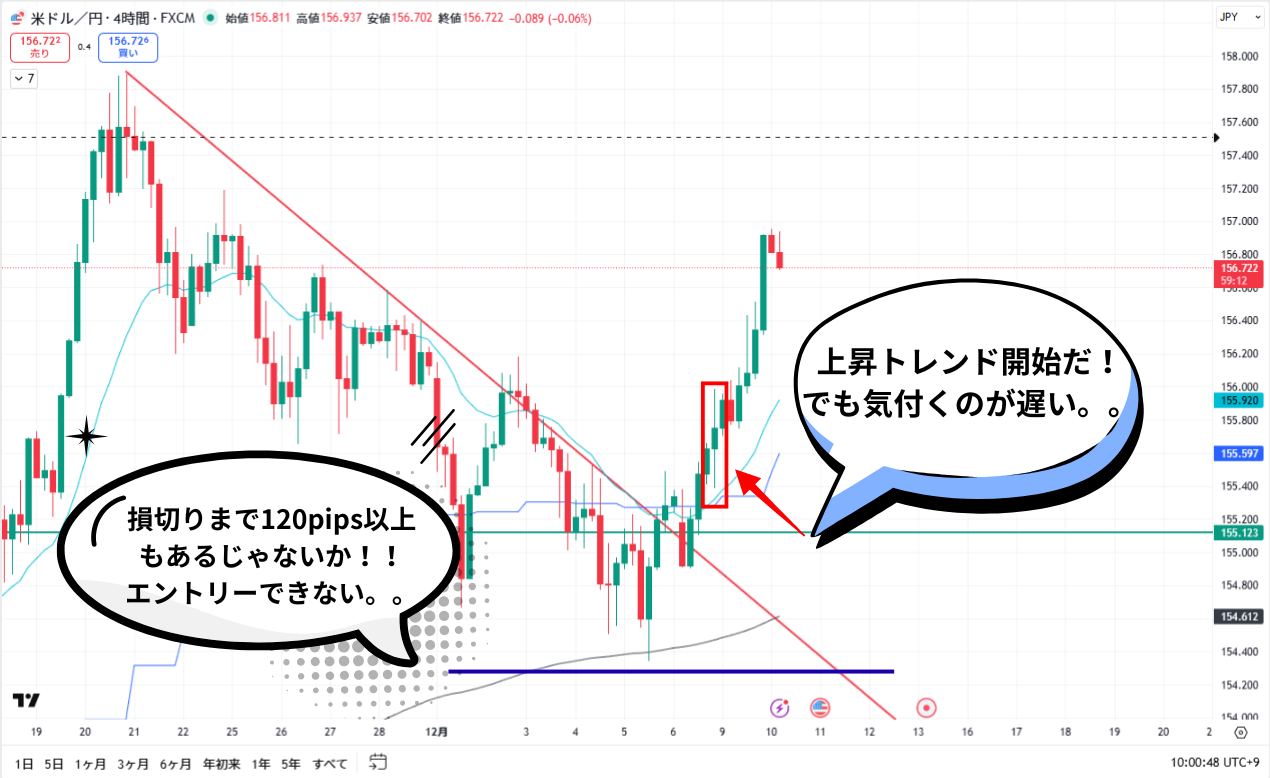 上昇トレンドが発生すると、大きく価格が上昇してしまいます。そのため、損切りラインが遠くなり、エントリーがしづらくなるのです。(←この気持ち、すごくわかります。)