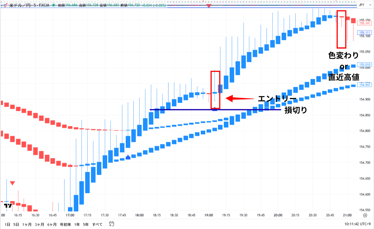 ⑤損切りは直近安値、利確は直近高値もしくは平均足の色変わり