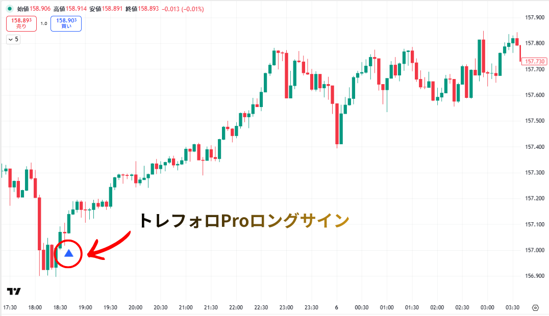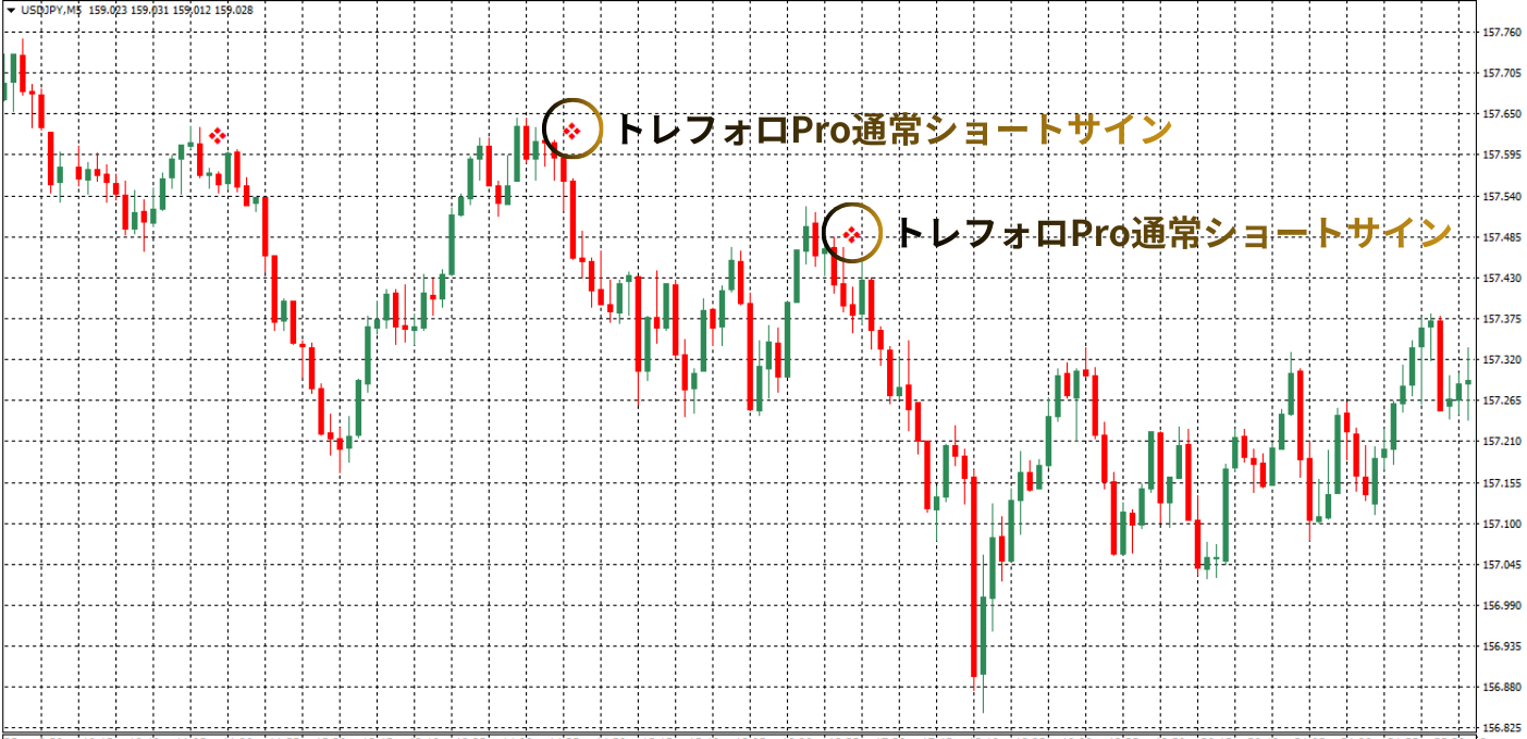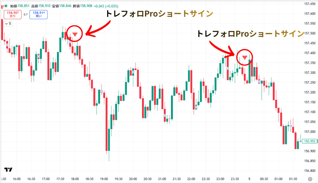 TradingView版のトレフォロProの通常サインは、ロングサインが▲、ショートサインが▼で表示されます。