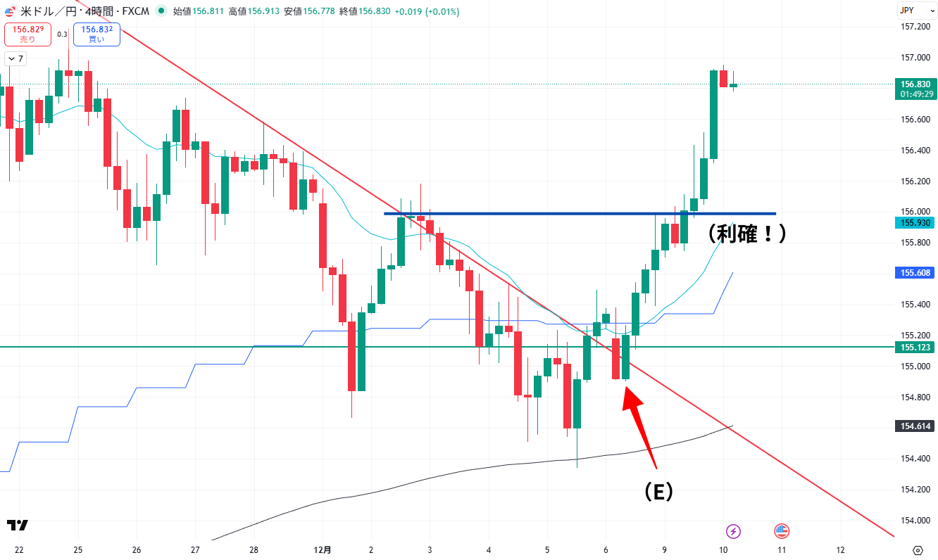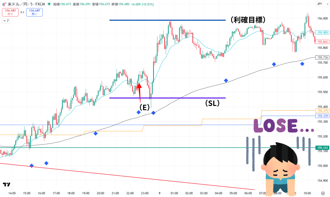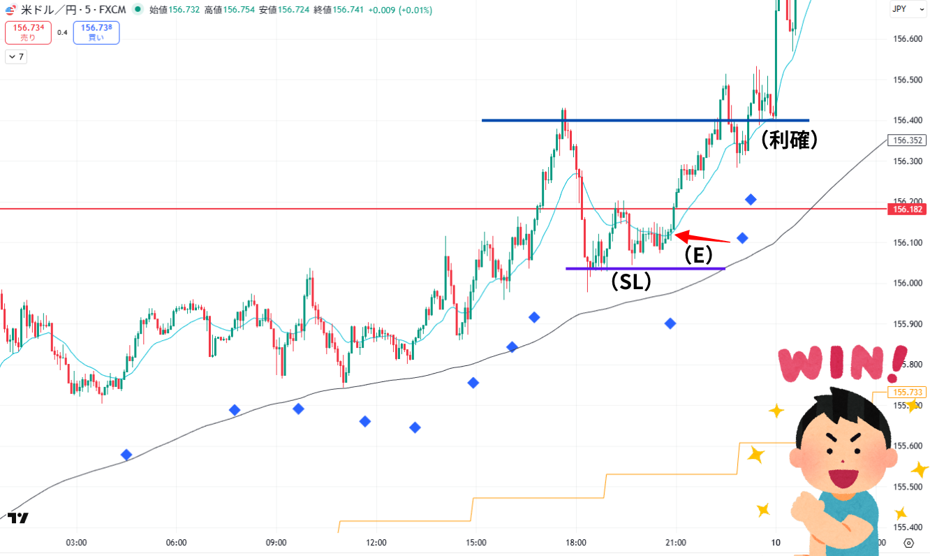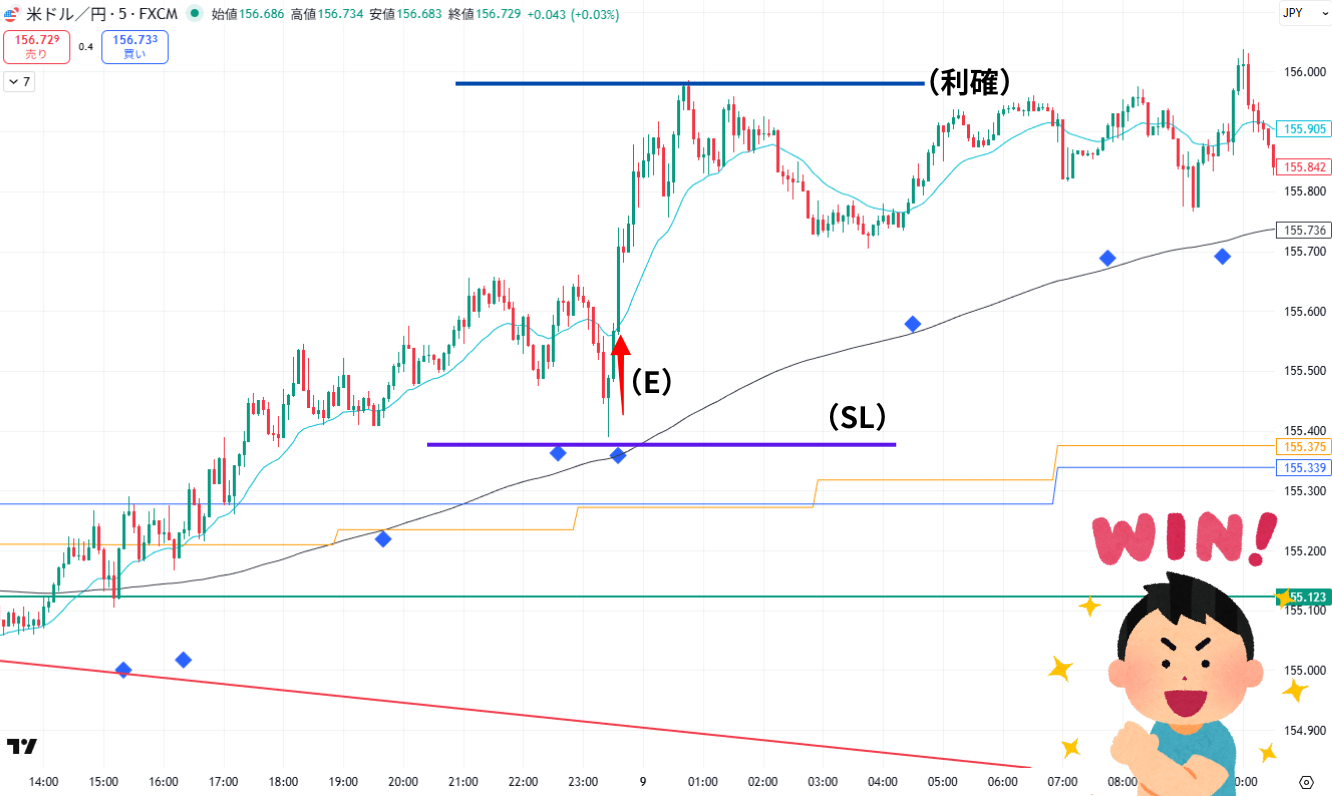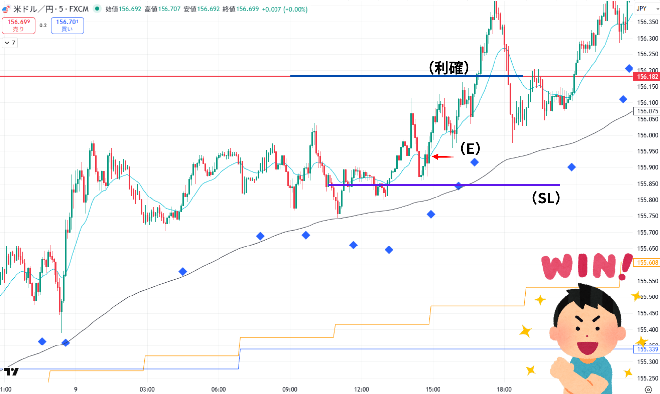 この場面では下に大きく振れ、燃料ができたのでそのまま156円付近まで伸びるかなと思ってエントリーしました。
