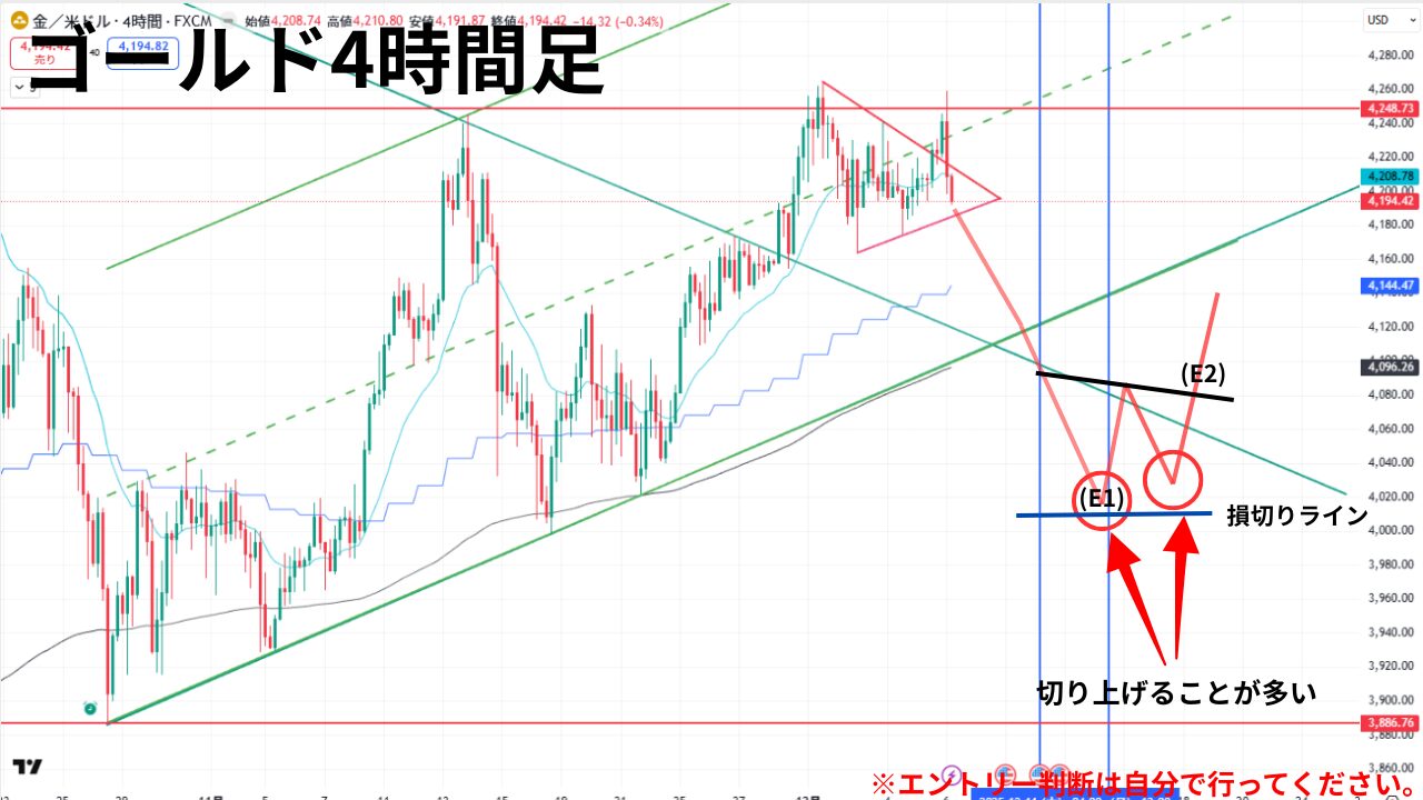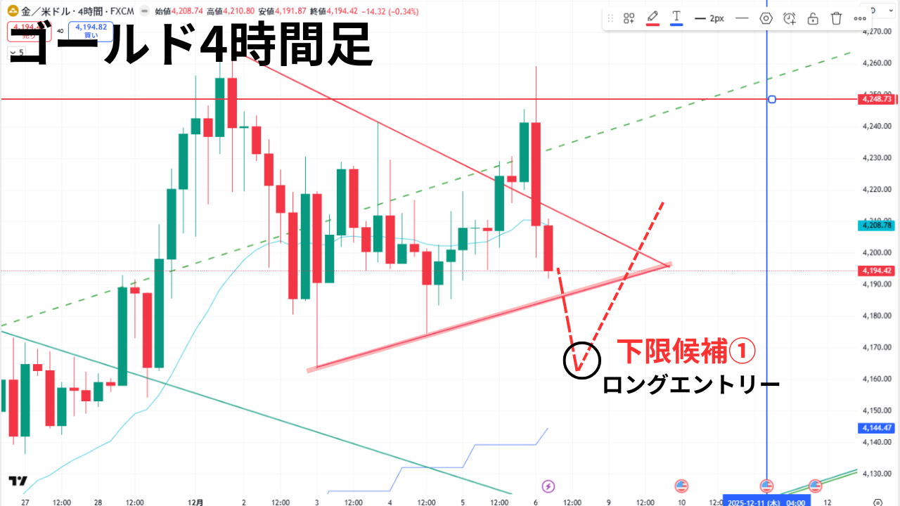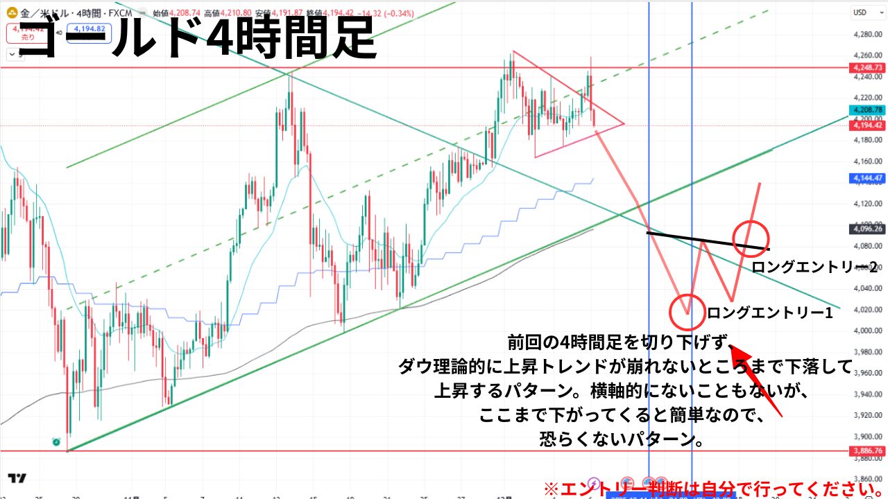 そして、ゴールドアノマリーのエントリーポイントは、4時間足で考えることになる。1回目の押し目買いポイントは、トレンドラインが引ける4165USD付近。