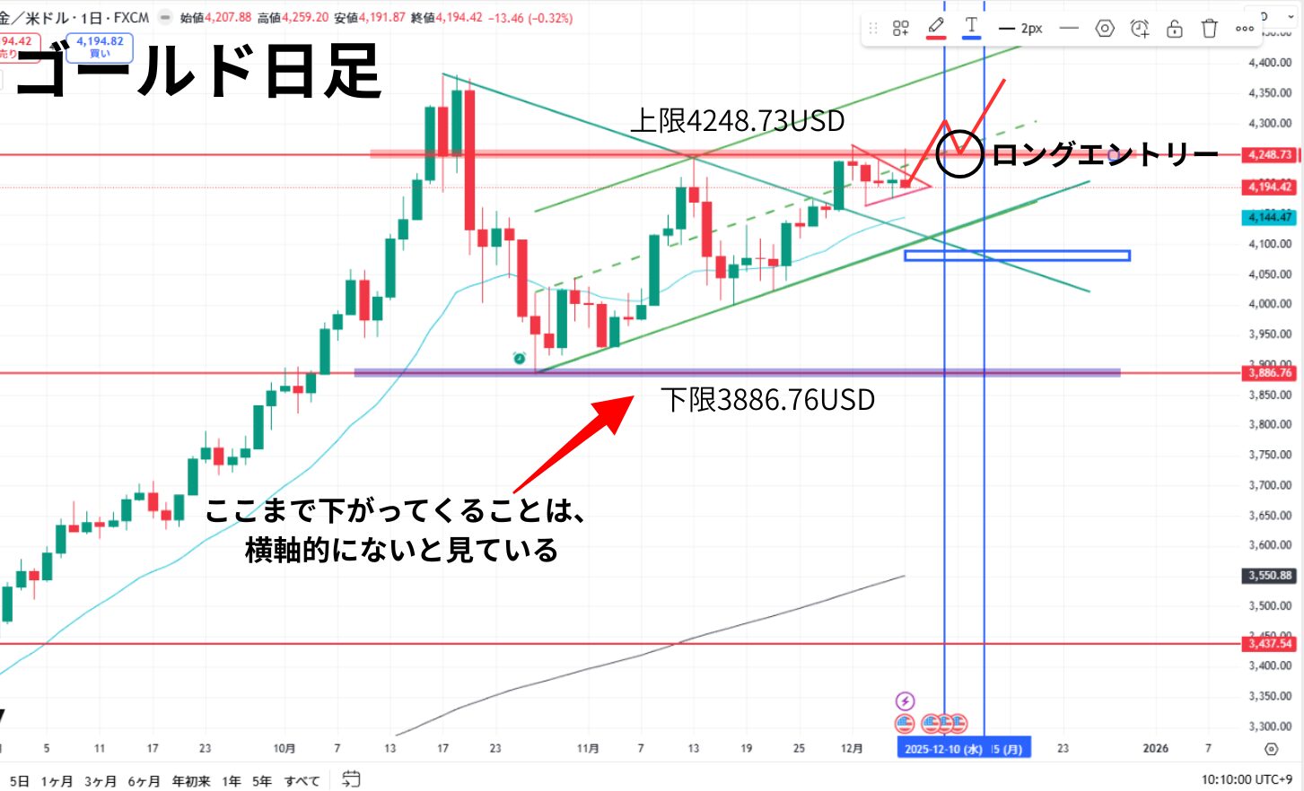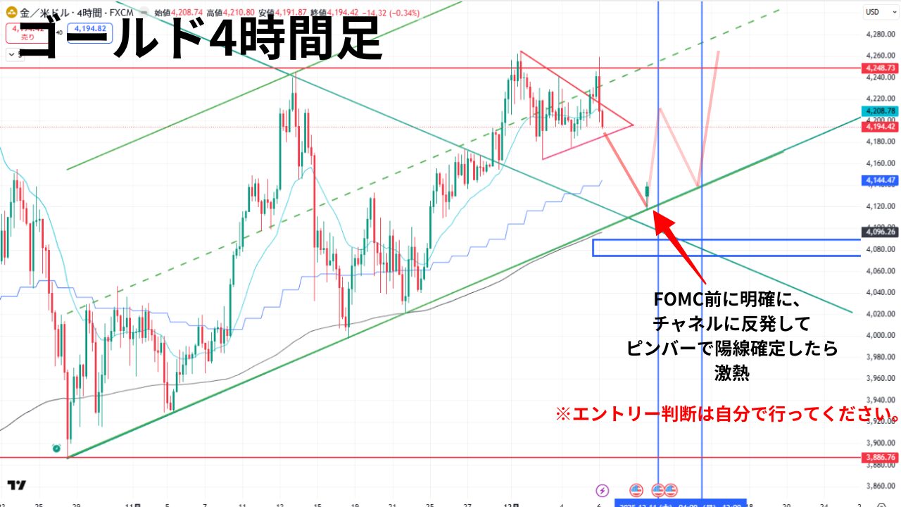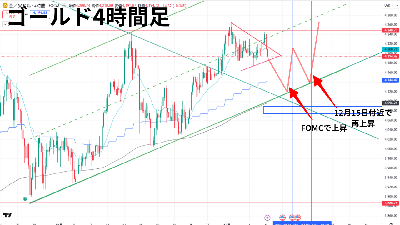 次の押し目買いポイントは、4112USD付近。ここでフラクタルを形成するパターン。12月10まで下限の4112USDに到達し、その後のFOMCで一時的に上昇、その後下落し、15日付近で再びトレンドラインにサポートされて上昇するパターン。
