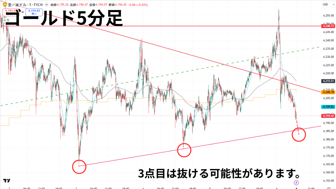 ゴールドが必ず上昇するときは5分足でチャートパターンを形成するため、焦ってエントリーしないこと。トレンドラインタッチでエントリーするのは非常に危険なので、注意する必要があります。
