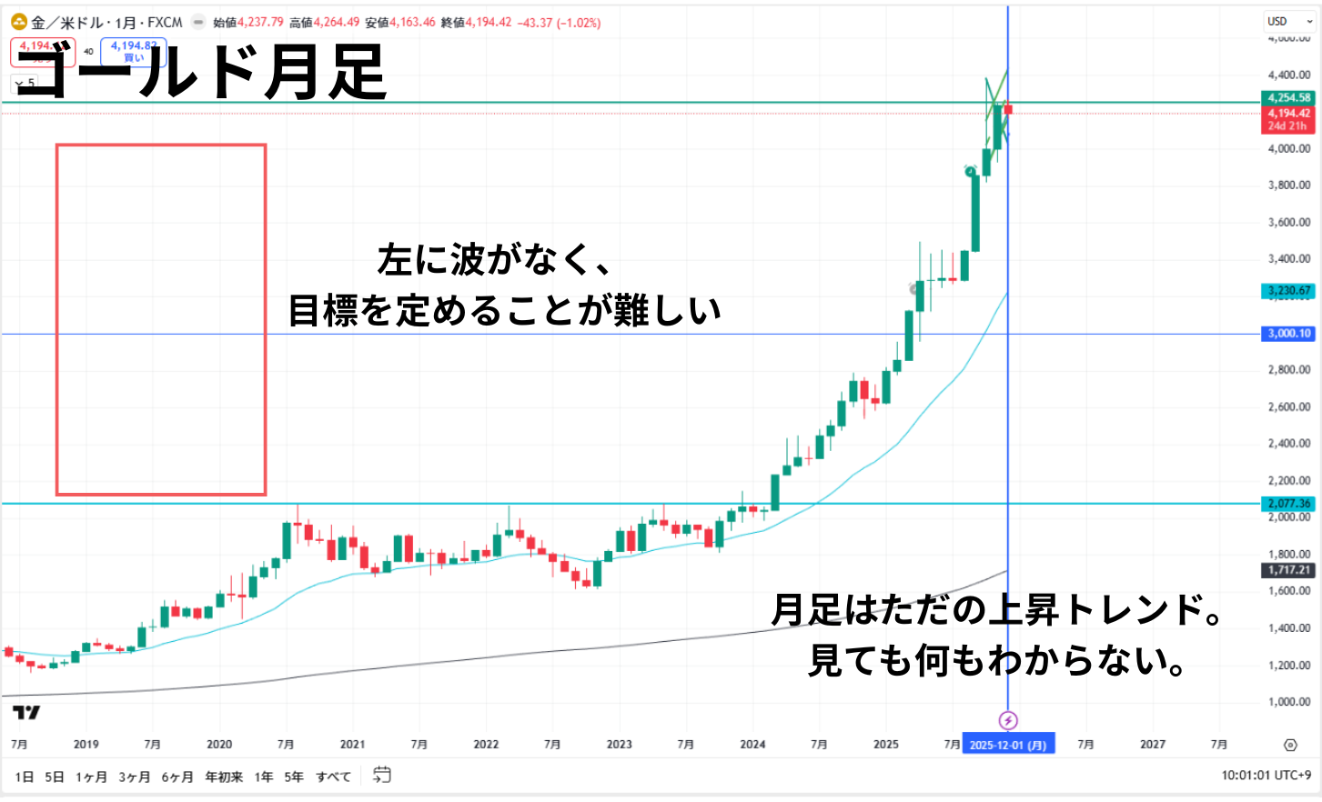 ゴールドの月足は一方的な上昇トレンド。今に始まったことではありませんが、左に波がなく、目標を見定めることは難しいです。