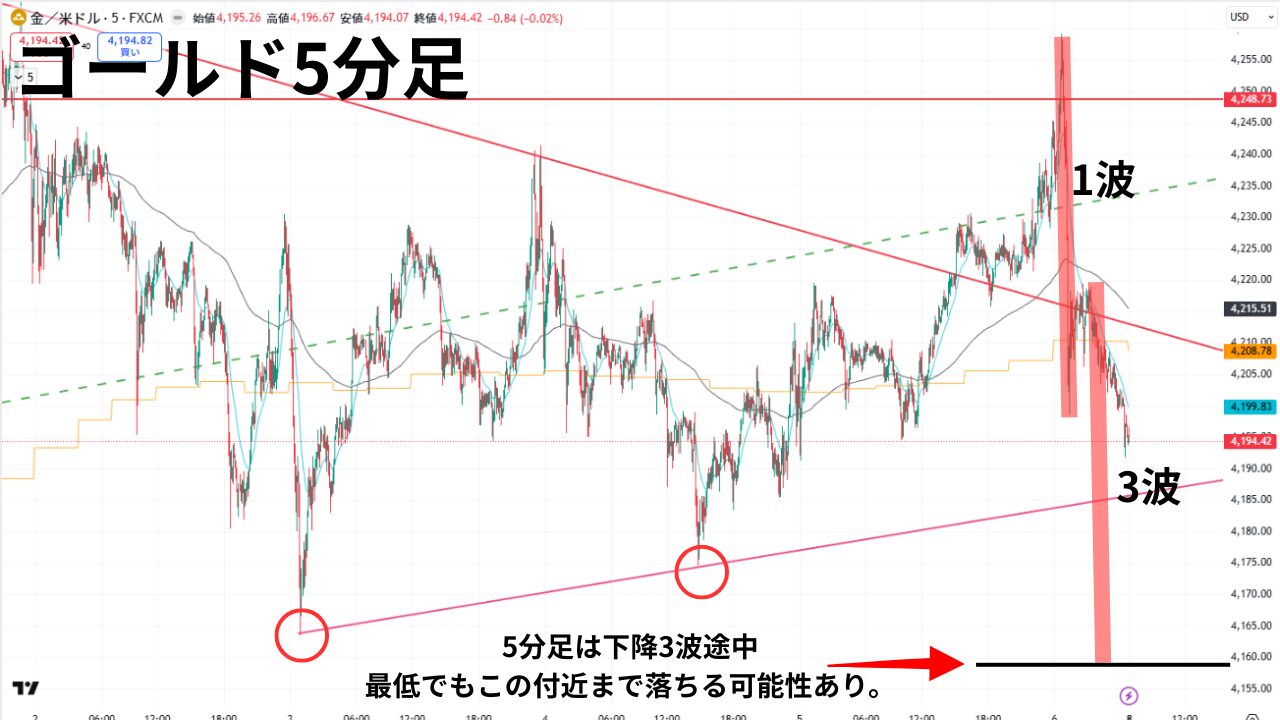 また、5分足で下降1波を形成しているため、3波途中であると見ると、トレンドラインではサポートされない。