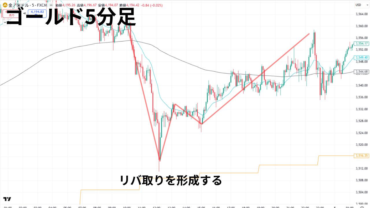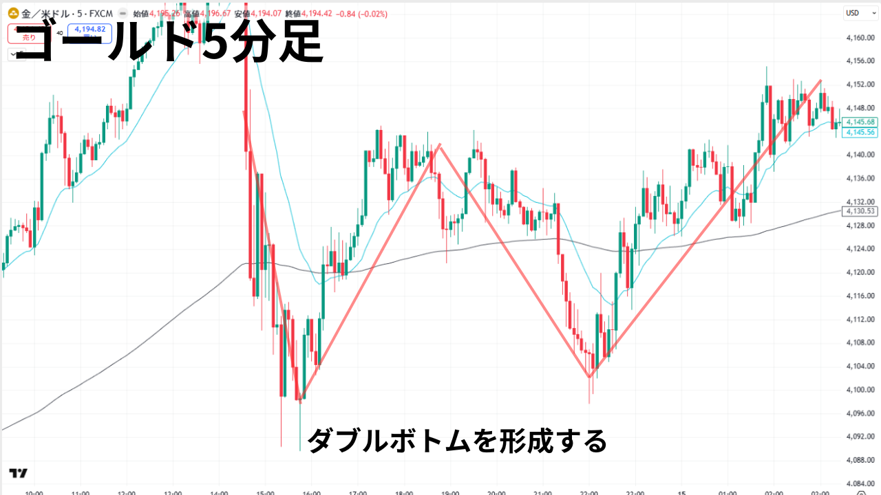 ゴールドの場合はしっかりとこのトレンドラインでサポートされるのではなく、ブレイクしてから上がる可能性がある。この場合、5分足で下記の画像のように、リバ取りの形を形成するか、ダブルボトムを形成したらエントリーするという流れになる。