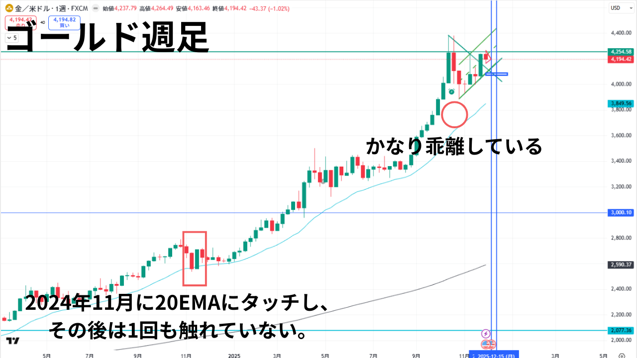 週足も月足と同様。20EMA付近まで下落したのは、2024年11月以降1回もなく、かなり強い上昇トレンドであることがわかります。
