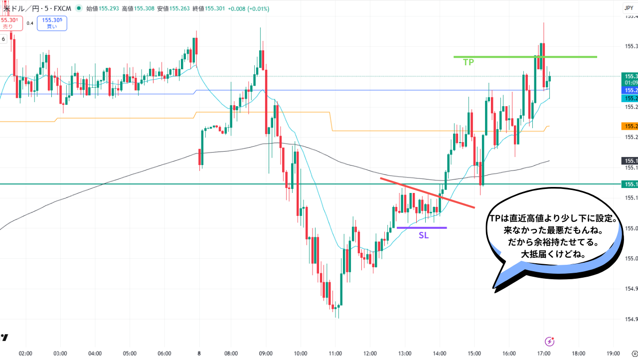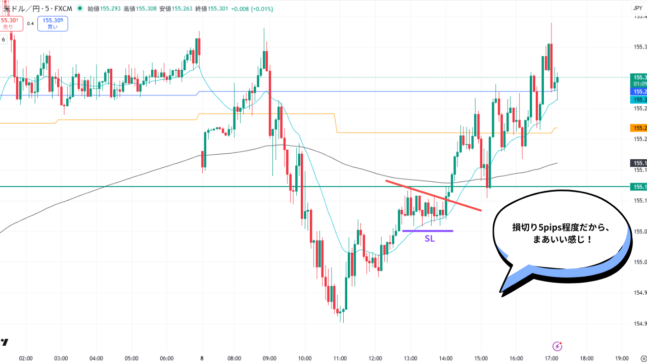 しかし、今回は短期足ということもあり、騙さる可能性も高いため、もう1本待ってエントリーしました。