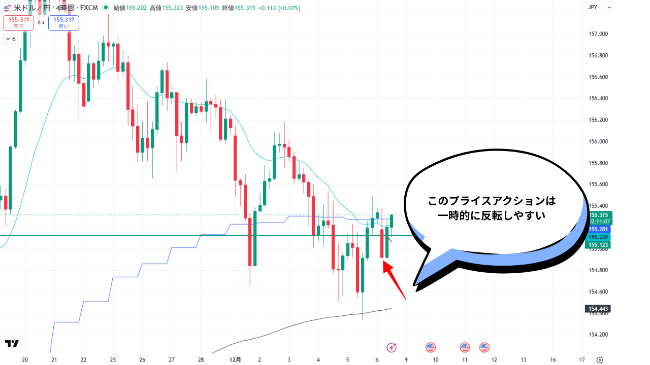 11時の4時間足確定を見ていましたが、底値圏で出やすいプライスアクションをしていました。