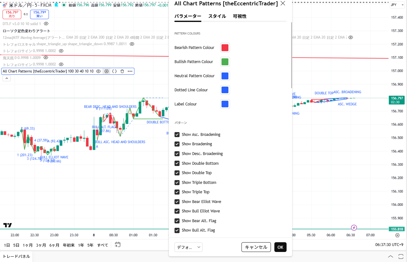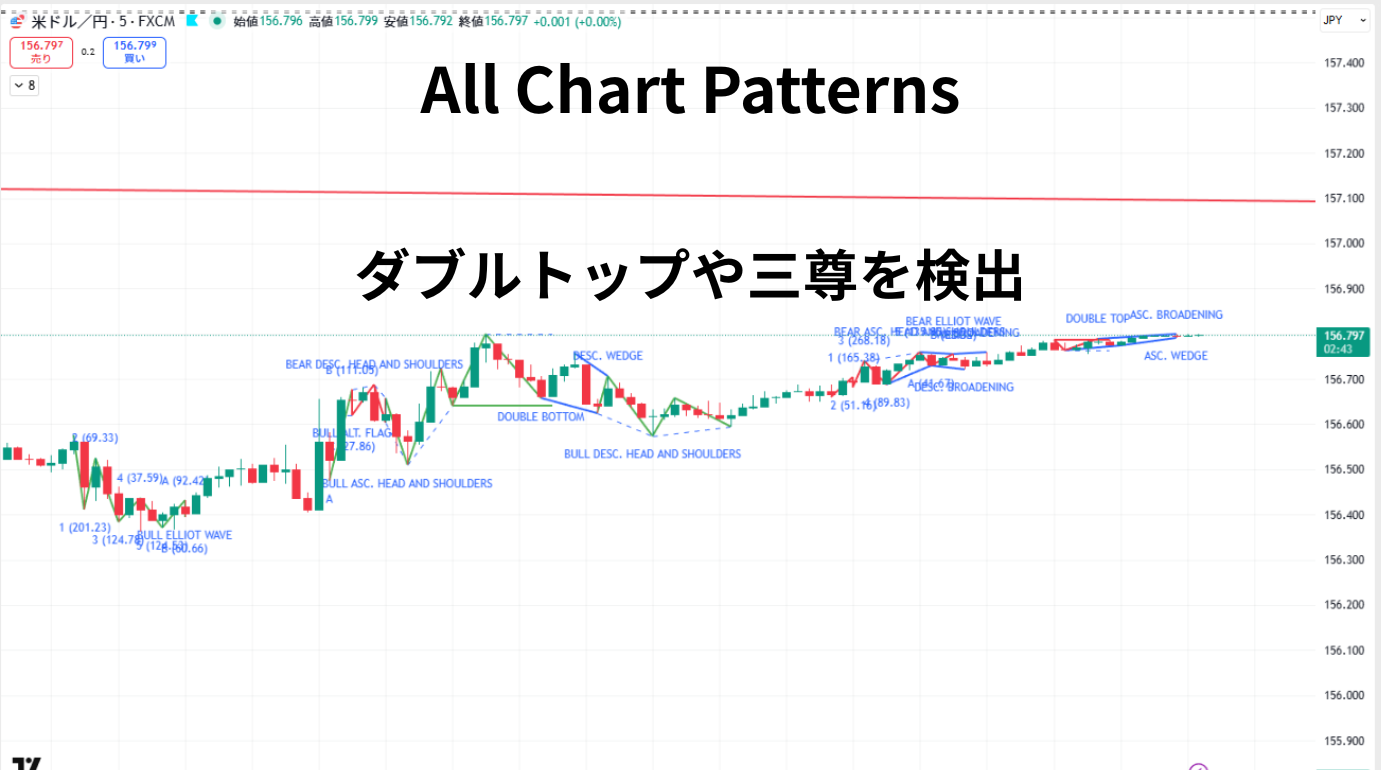 All Chart Patternsは、相場に出現する代表的なチャートパターンを自動で検出し、チャート上に表示してくれるインジケーターです。