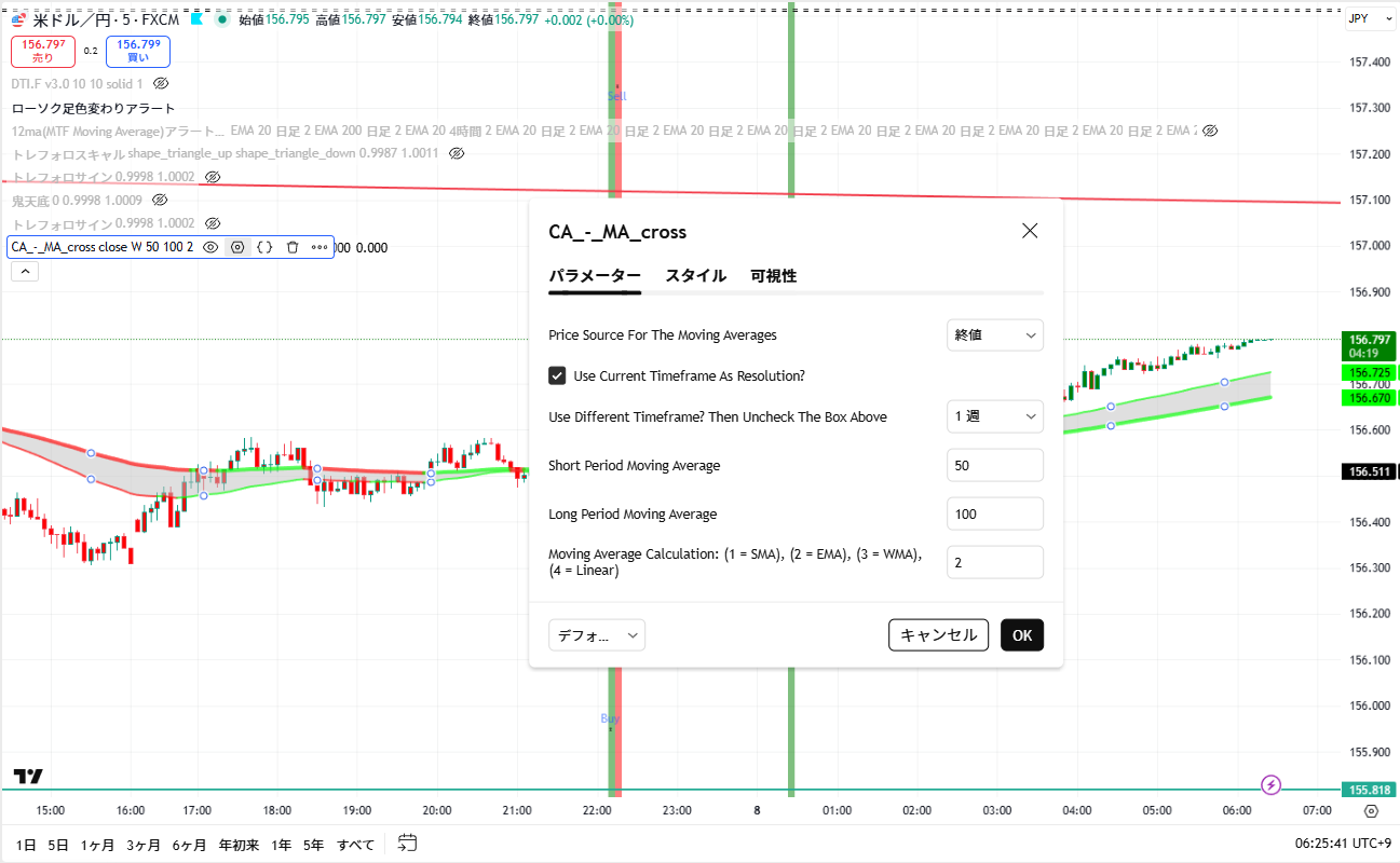 さらに、異なる時間足の移動平均線を表示できるため、例えば4時間足や週足のトレンドを確認しながら短期足でトレードするといった使い方も可能です。クロス時の矢印表示や背景色の有無も設定できるため、チャートの見やすさに合わせて調整するとよいでしょう。