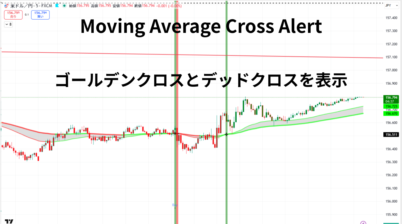 Moving Average Cross Alertは、2本の移動平均線が交差するポイントを視覚的に分かりやすく表示してくれるインジケーターです。