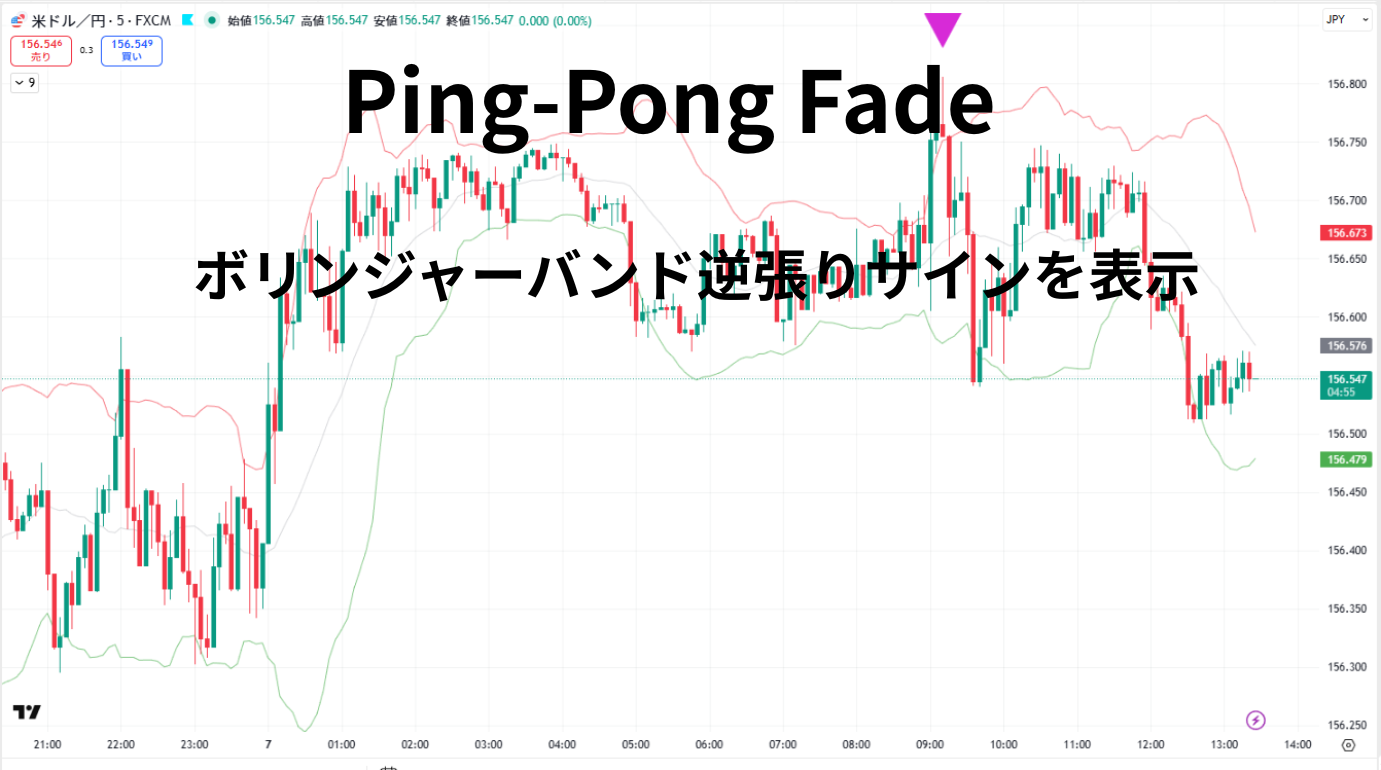 Ping-Pong Fadeは、ボリンジャーバンドを使った逆張り手法をベースに、出来高とローソク足の挙動を組み合わせて短期的な反転ポイントを検出するTradingView用インジケーターです。単純なボリンジャーバンドのタッチだけで逆張りを行うと、強いブレイクに巻き込まれやすいという欠点があります。