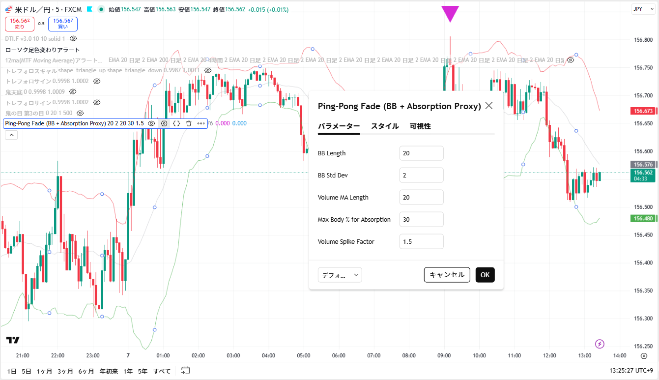 これら三つの条件、つまりボリンジャーバンドによる極端水準、出来高の増加、ローソク足による吸収や拒否のサインがすべて揃ったときに、Ping-Pong Fadeは逆張りシグナルを表示します。上側バンドで条件が揃った場合はショート方向のフェードシグナルとなり、下側バンドで条件が揃った場合はロング方向のフェードシグナルとなります。このインジケーターは、レンジ相場や持ち合い相場、日中の値幅が限定されやすい時間帯で特に効果を発揮します。