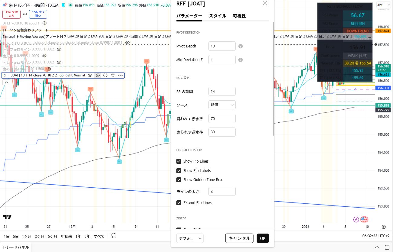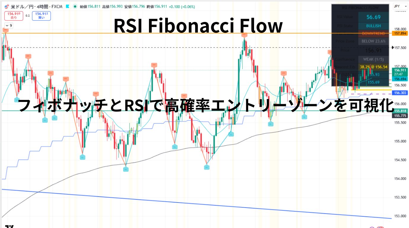 RSI Fibonacci Flowとは、フィボナッチ・リトレースメントの自動描画とRSIの勢い判定を組み合わせて、反発や反転が起きやすい価格帯を見つけやすくするTradingViewインジケーターです。