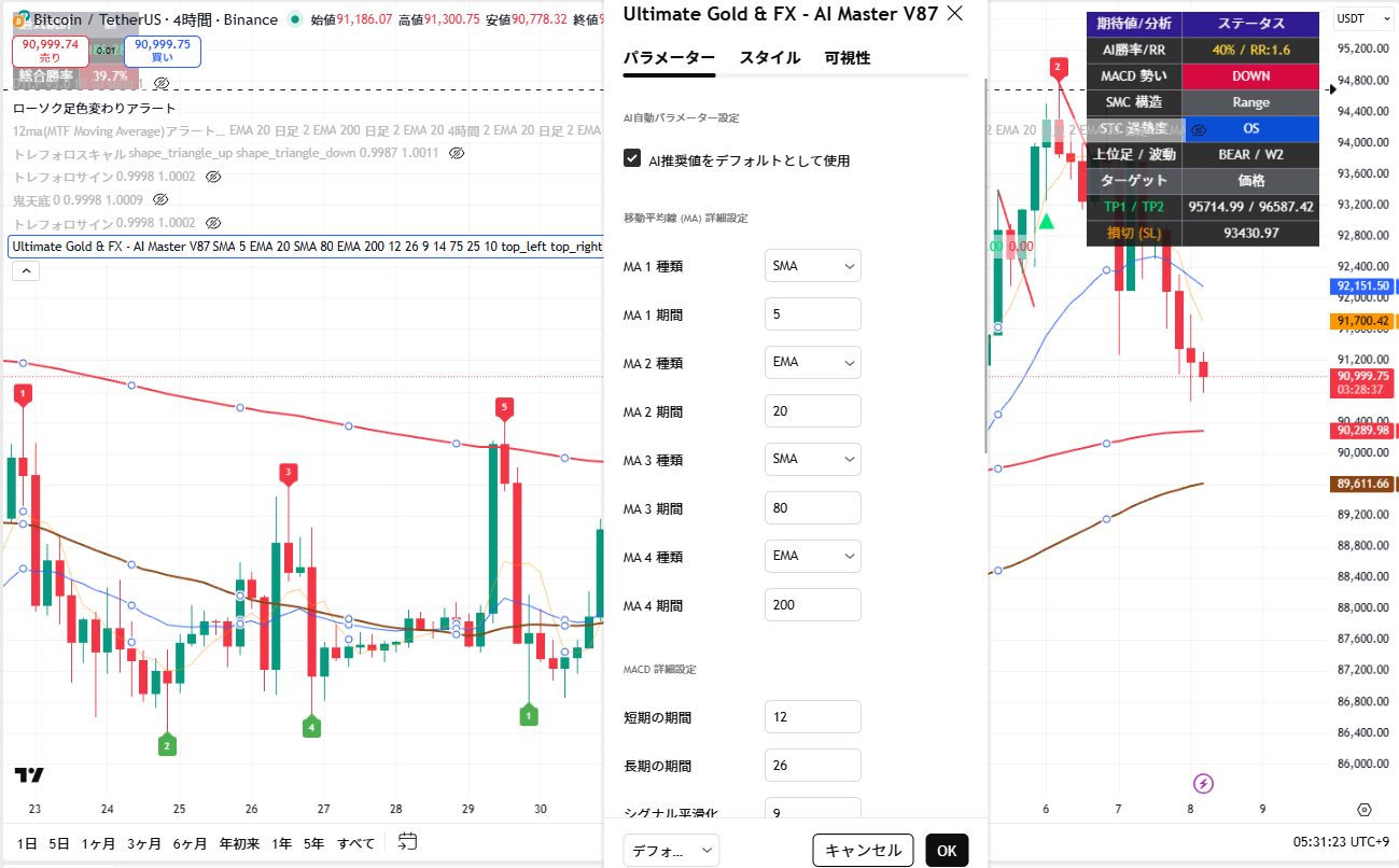 Ultimate Gold & FX K-NN Masterでは、MACD・STC・SMCの各パラメーターを細かくカスタマイズできるようになっています。
