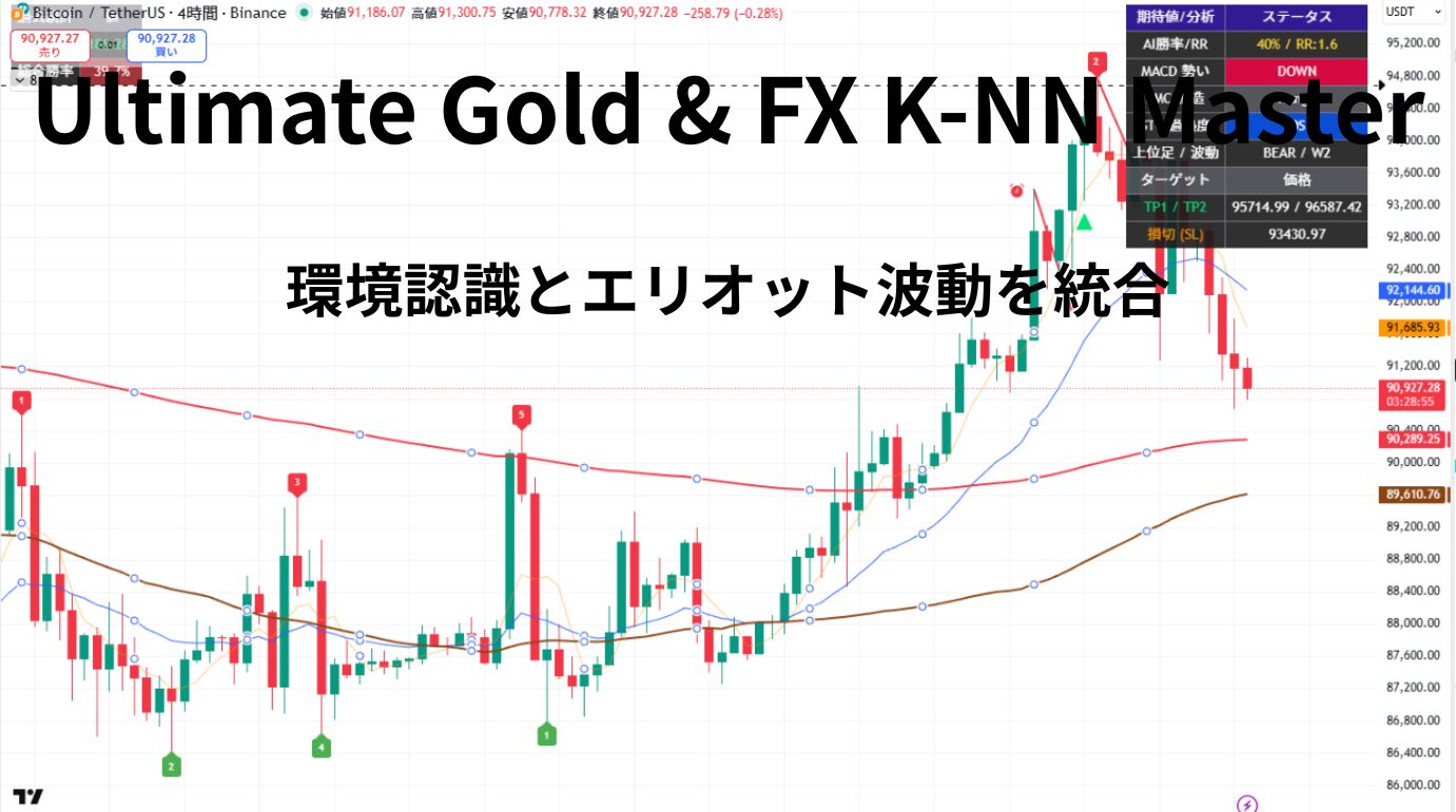 Ultimate Gold & FX K-NN Masterは、K-NN(K-Nearest Neighbors)アルゴリズムを用いた環境認識機能を中核に、MACD・STC・SMCといった主要テクニカル指標、さらにエリオット波動分析まで統合した高度な相場分析インジケーターです。