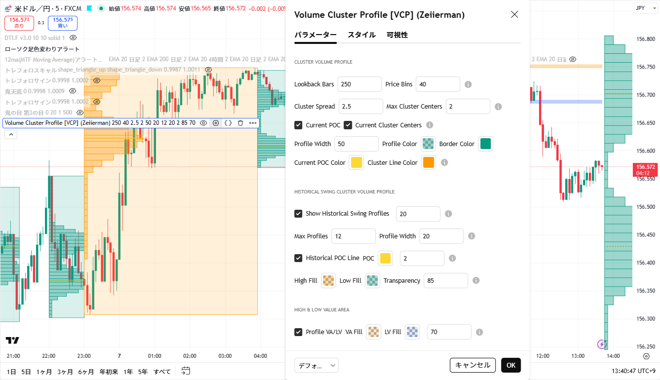 これらの設定を相場環境や時間足に合わせて調整することで、Volume Cluster Profileは裁量トレードにおいて非常に強力な分析ツールになります。